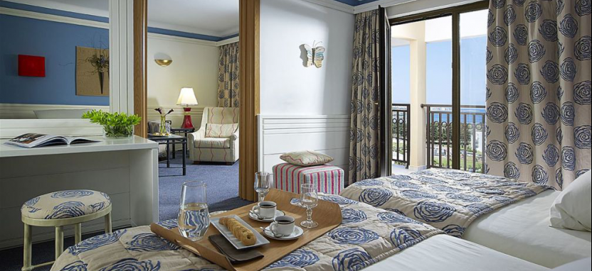Junior Suite Sea View 3 pax (38 кв. м) - спальня с гостиной зоной, ванная комната, балкон или терраса. Расположены в главном корпусе. Вид на море. Дополнительно: халат, тапочки, VIP завтрак, бесплатный приветственный пакет (вино, минеральная вода, тарелка фруктов, сладости), набор для приготовления чая/кофе, VIP банные принадлежности, пляжные полотенца, ежедневно: минеральная вода, пополнение набора для приготовления чая/кофе.
