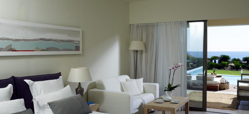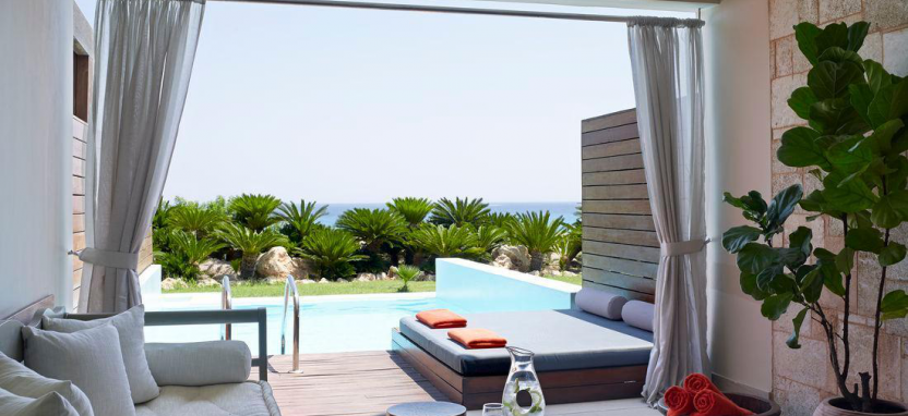 Sea Front Private Pool Suite 2 pax (56 кв. м) - в номере спальня с большой кроватью, гостиная зона, ванная комната с ванной и душем, терраса с мебелью и собственным бассейном. Вид на море.