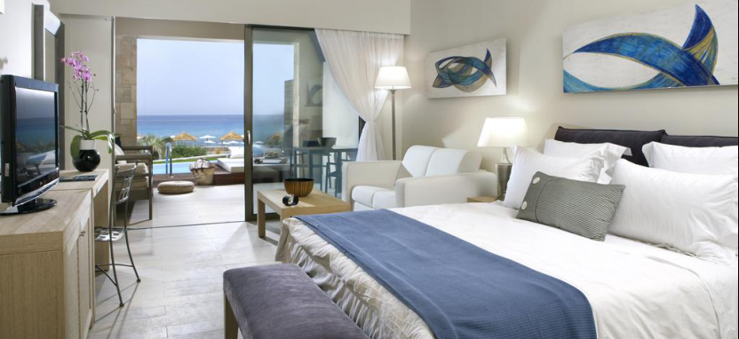 Prestige Pool Suite 2 pax (100 кв. м) - в номере спальня с большой кроватью, гостиная, столовая, две ванные комнаты с ванной и душем, терраса с мебелью, бассейн. Вид на море.