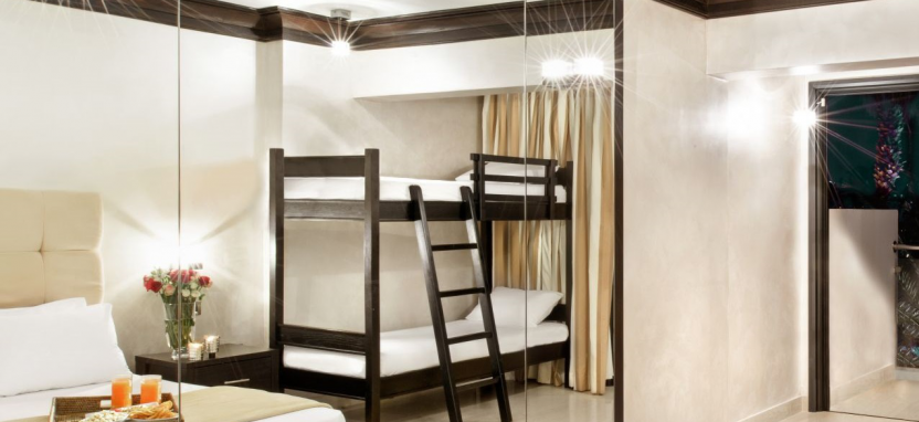 Quadruple Land View or Sea View 2+2 pax (25 кв. м) - в номере спальня с двумя односпальными кроватями и двухяростной кроватью, ванная комната. Вид на сад или море.