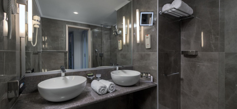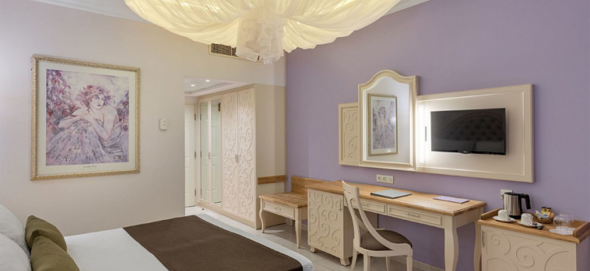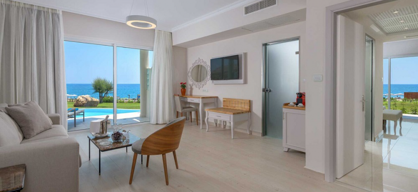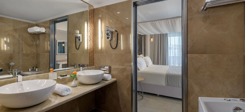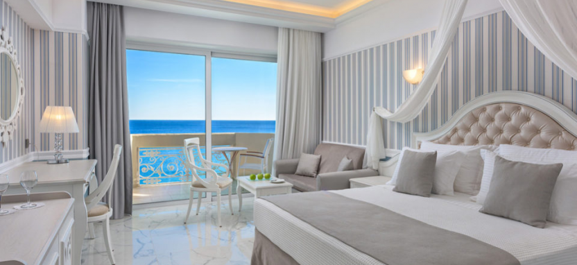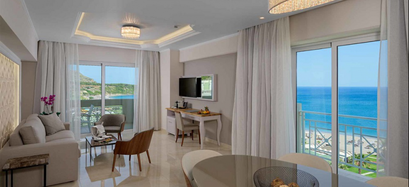 Suite Sea View, 3 pax (75 кв. м) - расположены в главном здании с большим меблированных балконом. В номере прихожая, большая гостиная с мягким уголком (включая диван, который трансформируется в кровать, на которой может разместиться третий взрослый или ребенок), столовая на 6 человек, стол, две отдельные мраморные ванные комнаты, одна с джакузи, другая с душевой кабиной, главная спальня с большой двуспальной кроватью.