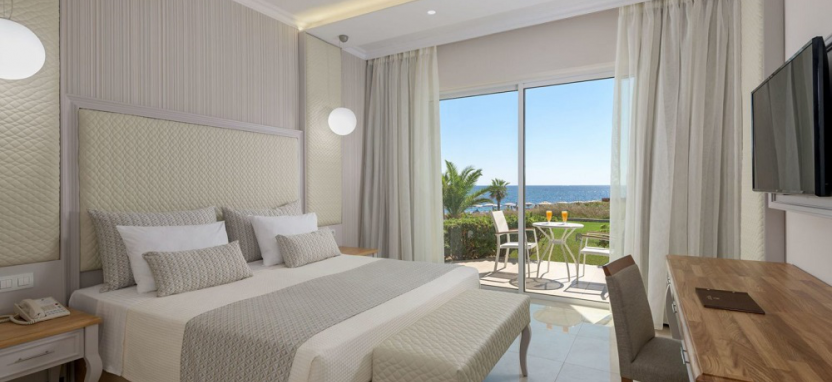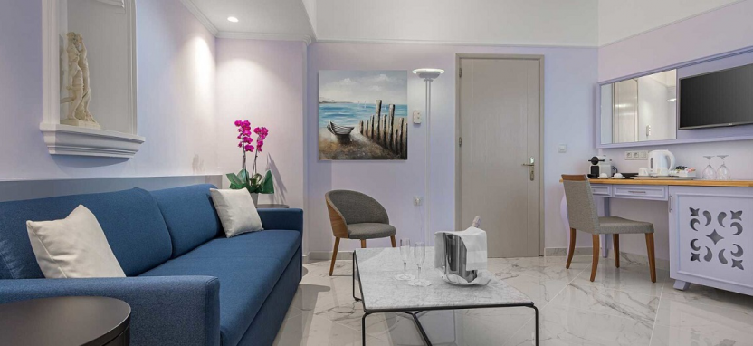 Junior Suite Sea View, 3 pax (45 кв. м) - расположены в главном здании, можно сделать смежные номера с номером Superior Deluxe. В номере спальня с двуспальной кроватью размера «queen-size», отдельная гостиная с большим диваном-кроватью, меблированный балконом, ванная комната.
