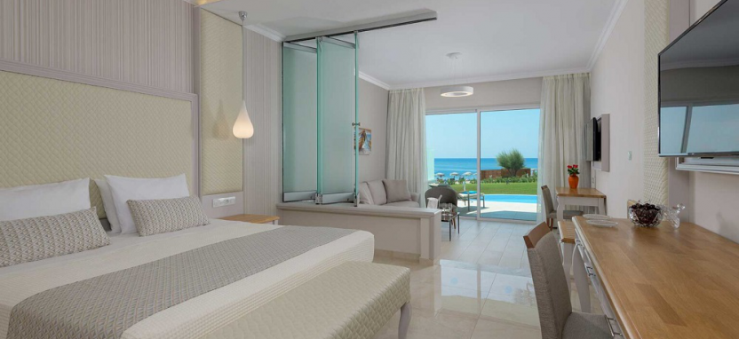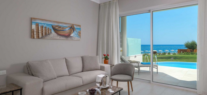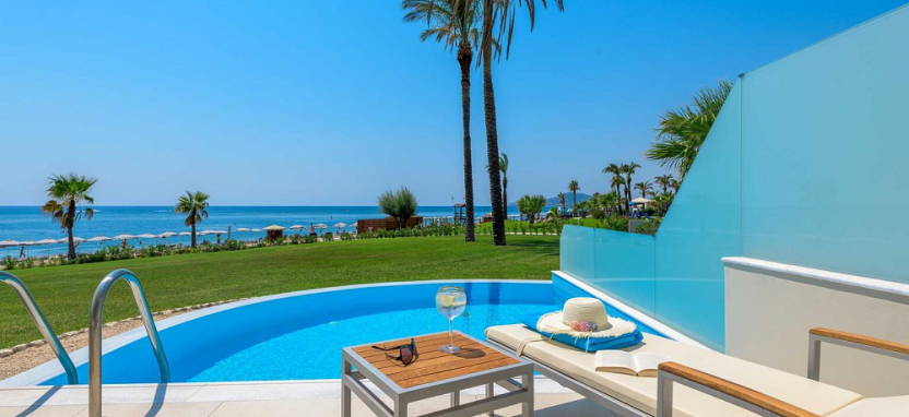 Executive Suite with Private Pool Sea View, 3 pax (50 кв. м) - расположены на первом этаже отдельного здания, в непосредственной близости от пляжа с собственным бассейном. В номере просторная гостиная с собственной террасой и частным бассейном, в котором может разместиться еще один взрослый или ребенок на диване-кровати. В главной спальне есть кровать размера "king-size" и собственная терраса в саду. В просторной мраморной ванной комнате с двойным входом есть душевая кабина, ванна-джакузи и две раковины.