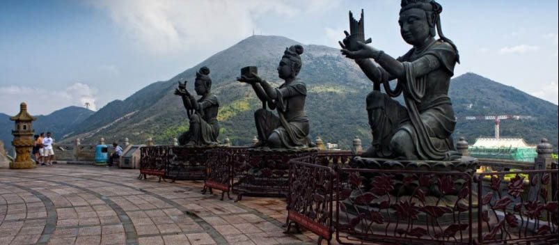 Насладиться необычным колоритным пейзажем и заливом с высоты птичьего полета позволяют монументальные постройки и смотровые площадки. В их числе большая статуя сидящего Будды (34 м и 268 ступеней), Львиная гора (495 м), 118-ти этажный коммерческий центр и знаменитый Пик Виктория.
