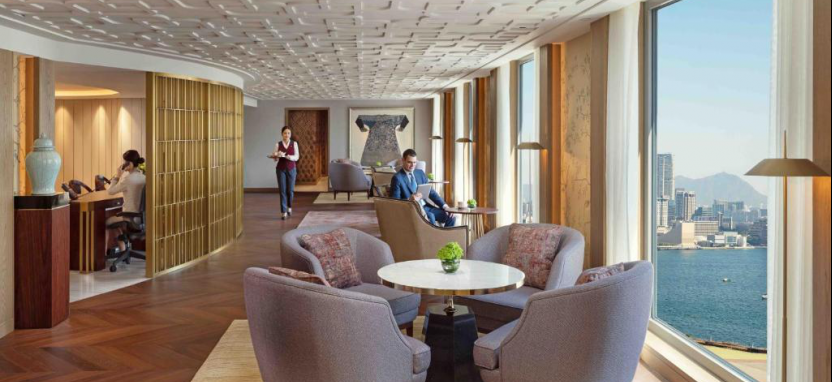 Meiji Suite (80 кв. м) - в номере гостиная, спальня с кроватью king-size, гардеробная, ванная комната с ванной и душевой кабиной, гостевой туалет. Вид на гавань Виктория и п-ов Коулун.