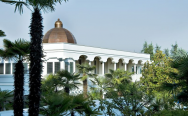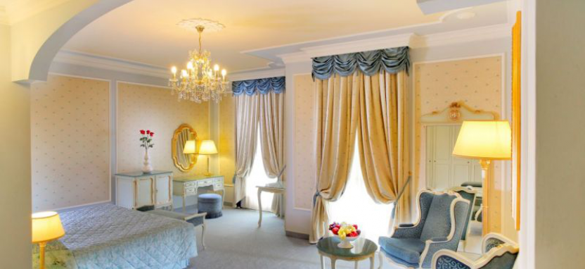 Imperial Suite in the Exclusive wing (65 кв. м) - роскошный имперский сюит в здании Exclusive, оформленный в утонченном классическом стиле в пастельных и голубых тонах, прекрасный вид на живописный сад отеля и термальные бассейны, 1 этаж, просторная гостиная зона, спальня, просторная и светлая ванная комната, отделанная мрамором, с ванной и душевой кабиной, большой балкон.