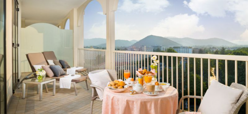 Deluxe Room (39-45 кв. м) - просторные номера, вид на сад отеля и термальные бассейны или на променад курорта Абано Терме и холмы, спальня, ванная комната с ванной или душевой кабиной, балкон.