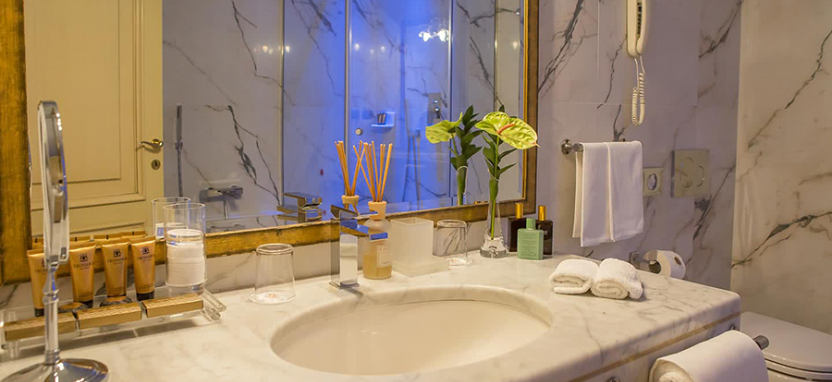 Deluxe Room (32 кв. м): оформлен в нежных и теплых пастельных тонах в классическом стиле. В декоре интерьера использованы ценные светильники из муранского стекла, античная мебель и благородные ткани. Состоит из спальни, зоны отдыха и ванной комнаты, отделанной каррарским мрамором.