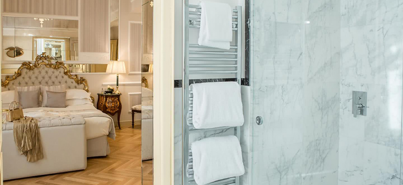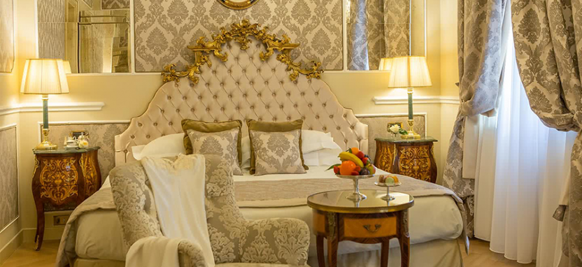 Junior Suite (50 кв. м): обставлен антикварной мебелью и оформлен в классическом венецианском стиле с использованием драпировок из благородных тканей теплых тонов или в французском стиле XVIII века. Оригинальное смешение стилей позволяет успешно совместить старинные детали с технологией последнего поколения. Состоит из спальни с кроватью double, гостиной зоны, ванной комнаты, отделанной белым мрамором, и балкона. Номера, оформленные в французском стиле XVIII века, оборудованы балконом с видом на главную улицу города.