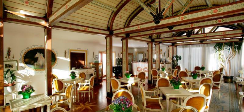 Основной ресторан отеля, оформленный в голубых тонах, с готическими арками и росписью на стенах, предлагает блюда интернациональной кухни.