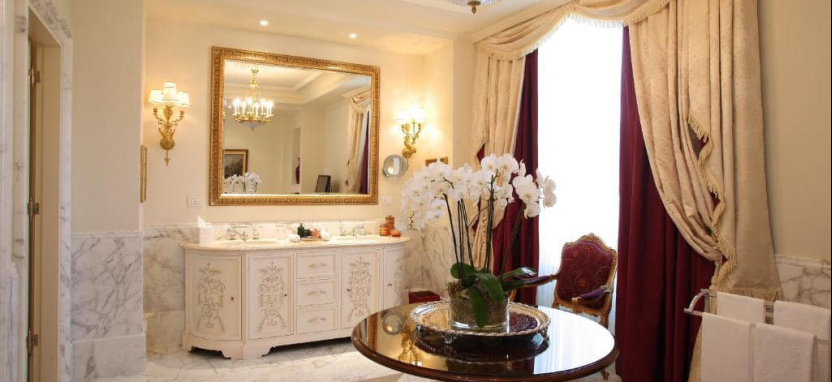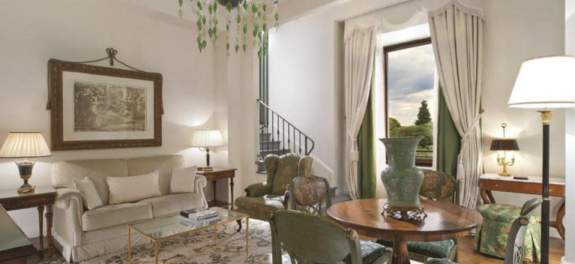 Royal (Suite Della Gherardesca) (234 кв. м) - в номере гостиные, столовая (стол на 8 персон), спальня с кроватью king-size, ванная комната с ванной и душевой кабиной, гостевой туалет. Вид на сад.