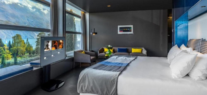 Junior Suite Lake View (55 кв. м) – спальня с зоной гостиной, ванная комната. Вид на озеро и горы.