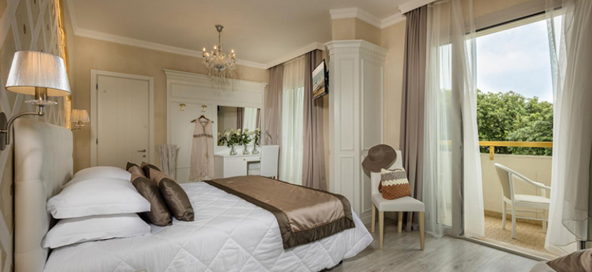 Charme Room (15 - 17 кв. м): в номере есть панорамный балкон со столом и стульями, паркетные полы, ванная комната с душем, феном и душевыми принадлежностями, пляжные полотенца, стол, телевизор со спутниковыми каналами, минибар, сейф, телефон, кондиционер, беспроводной интернет.