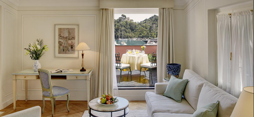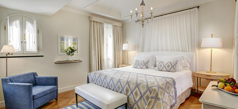 Junior Suite (35 кв. м): выполнен в солнечных тонах, состоит из спальни с кроватью king-size или двумя кроватями twin, гостиной зоны, мраморной ванной комнаты с ванной и душем, балкона или террасы с видом на Пьяцетту и гавань.