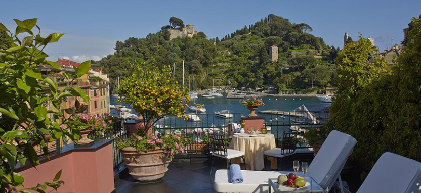 Ava Gardner Suite (50 кв. м): роскошный номер, занимающий весь верхний этаж отеля, включает спальню с кроватью king-size, большую гостиную с панорамными, от пола до потолка окнами, мраморную ванную комнату с окнами, ванной, отдельным душем и двухсекционной раковиной, просторную меблированную террасу с лимонными деревьями, зеленью и великолепным панорамным видом на гавань, залив Портофино и замок Браун.