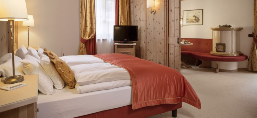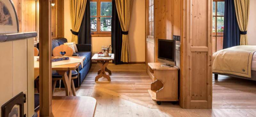 Luxury King Suite “Arancio” (48 кв. м) – номера выдержаны в теплых оттенках оранжевого цвета и располагают балконами на южную сторону с видом на горы и часть городка (в сьюте на первом этаже – небольшая лужайка). Все три номера (Arnica 105, Cirmoli 205, Marmotte 305) состоят из спальни с двуспальной кроватью (можно также сделать две раздельные кровати), отдельной гостиной с фаянсовой печью и дополнительной кроватью и просторной ванной комнаты с разделенным санузлом (душ Teuco с гидромассажем, ванна, биде). А в сьютах Cirmoli и Marmotte также предусмотрены гардеробные при входе. Стены номеров обшиты панелями из натуральной сосны, а на полах ковровое покрытие из чистой шерсти.