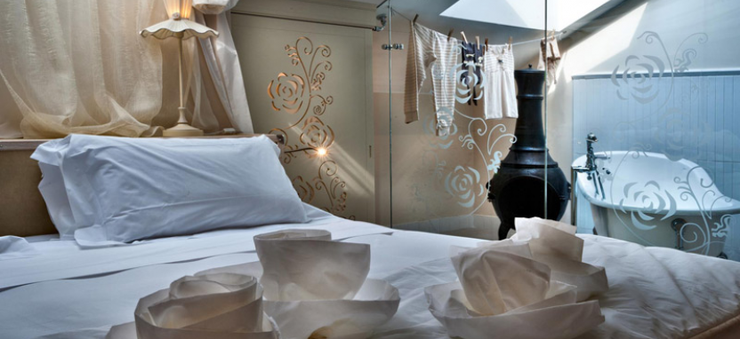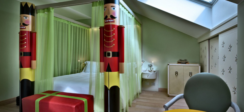 Schiaccianoci Deluxe Room (38 кв. м) - роскошные номера с тематическим дизайном интерьера, верхний этаж, спальня с большой двуспальной кроватью с балдахином, ванная комната.