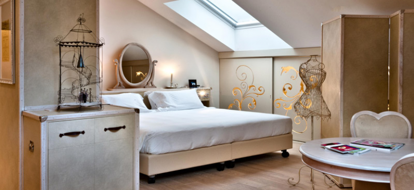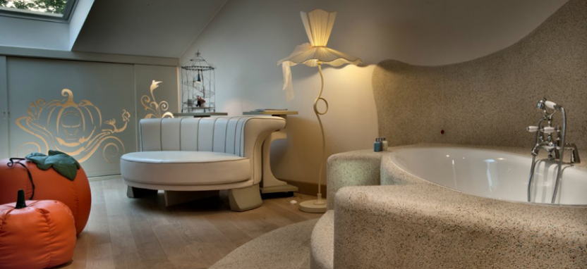 Cenerentola Suite (60 кв. м) - просторный сюит с открытой планировкой и тематическим дизайном интерьера, верхний этаж, просторная гостиная зона, спальня с большой двуспальной кроватью, ванная комната с ванной и душем.