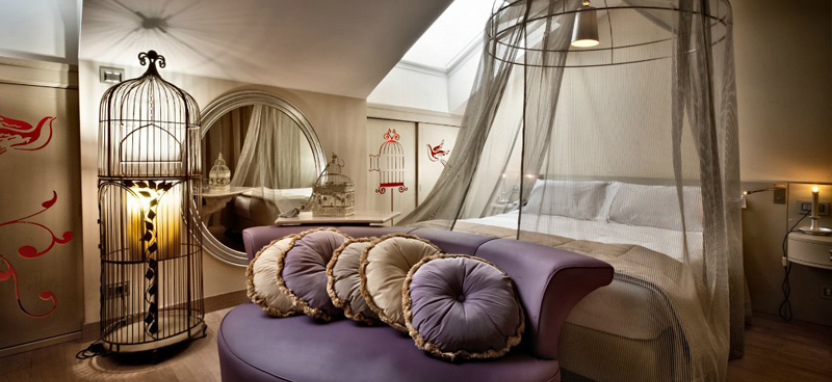 Uccello di Fuoco Junior Suite (35 кв. м) - элегантные сюиты с тематическим дизайном интерьера, оформленные в фиолетовых и белых тонах, верхний этаж, гостиная зона, спальня с большой двуспальной кроватью с балдахином, ванная комната с ванной или душевой кабиной и турецкой баней.