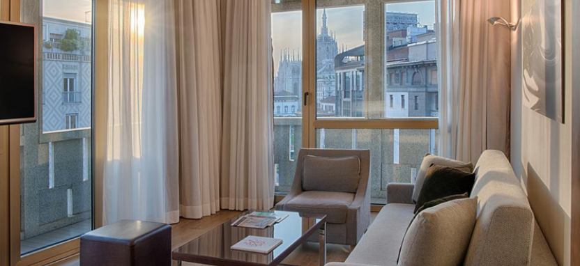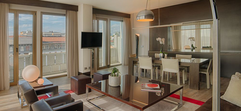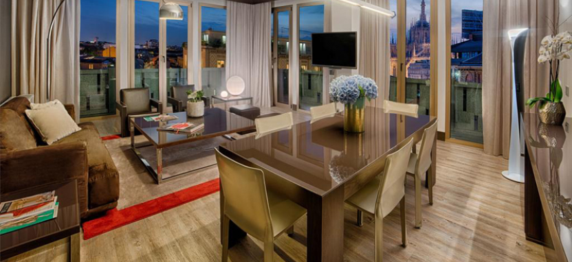 Duomo Suite 4 pax (75 кв. м) - роскошные сюиты, оформленные в современном стиле, вид на город и кафедральный собор Duomo, просторная отдельная гостиная с диваном и рабочим столом, обеденная зона, элегантная спальня с большой двуспальной кроватью, ванная комната, балкон.