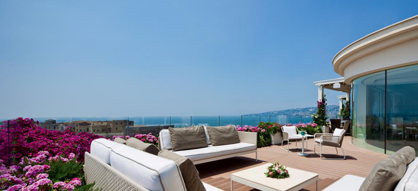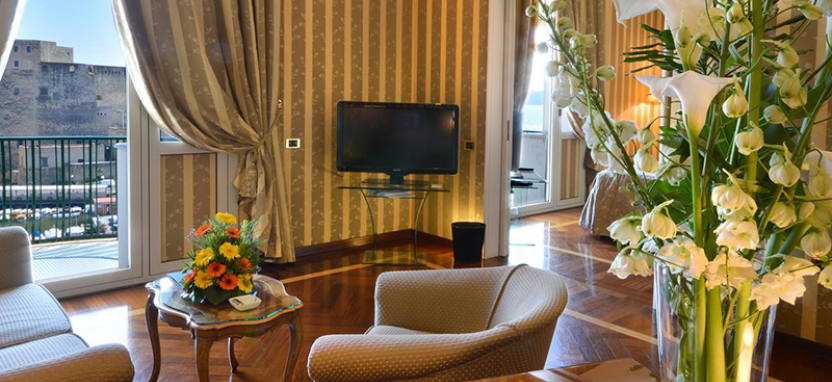 Deluxe Junior Suite (43-45 кв. м): просторный, изящно меблированный номер с захватывающим видом на Неаполитанский залив, состоит из спальни с гостиной зоной, ванной комнаты с джакузи, балкона с видом на море.
