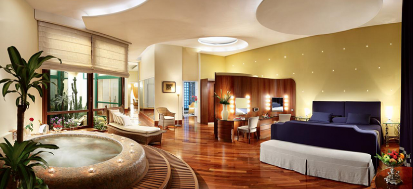 Presidential Suite (300 кв. м): роскошный номер представляет собой образец современного итальянского дизайна. В создании аристократичного интерьера использована антикварная мебель, благородные ткани, муранское стекло и паркет ручной работы из ценных пород дерева. Состоит из просторной спальни, гостиной, столовой, ванной комнаты, отделанной мрамором, с джакузи, балкона.