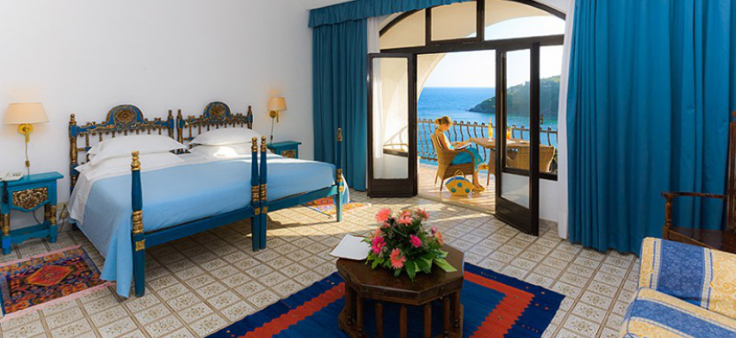 Deluxe Room (28 кв. м) – просторные номера в бело-синих тонах, с гостиной зоной и кроватью king-size. С просторного балкона, оборудованного столиком, стульями и шезлонгом, открывается потрясающий вид на море и бухту. Предоставляются халаты и тапочки. В ванной комнате душ и ванна. Телевизор 32 дюйма.