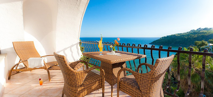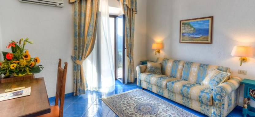 Junior Suite (35 кв. м) – просторный элегантный номер с балконом и оборудованной террасой с видом на море, состоит из двух комнат, разделенных дверью и небольшой лестницей. Два телевизора – 26 и 40 дюймов. Предоставляются халаты и тапочки. Максимальное размещение – 4 гостя (раскладная софа в гостиной).