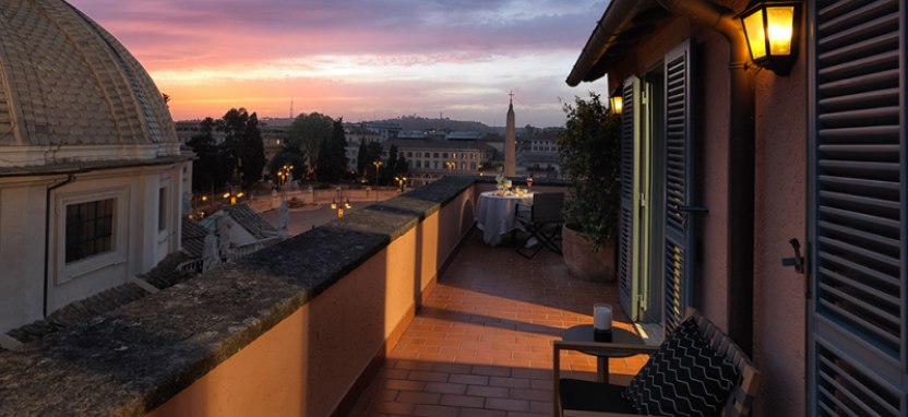 Popolo Suite 2 pax (100 кв. м) - роскошный сюит на верхнем этаже, потрясающий вид на Пьяцца дель Пополо и крыши Рима, отдельная гостиная с рабочей зоной, спальня с большой двуспальной кроватью, просторная ванная комната, декорированная мозаикой и мрамором, просторная широкая терраса (45 кв. м).