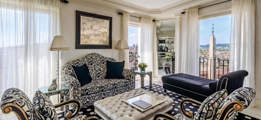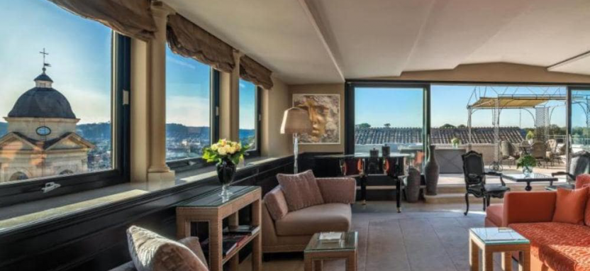Presidential Suite San Pietro (80 кв. м) - эксклюзивный президентский сьют на 6 этаже, декорированный уникальной витриной с оригинальными античными римскими экспонатами и старинным столом конца XVIII века, захватывающий вид на San Pietro Dome и Испанскую лестницу, отдельная гостиная, обеденная зона, спальня, главная ванная комната, отделанная мрамором, с джакузи и душевой кабиной, дополнительная гостевая ванная комната, частная панорамная терраса с зоной отдыха, сюит данной категории можно объединить с двухместным номером.