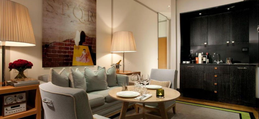 Portrait Studio 2 pax (33 кв. м) - эксклюзивные номера-студио прямо над бутиком Сальваторе Феррагамо, дизайн которых выполнен в розовых и серых тонах, вид на город, гостиная зона, кухонный уголок, спальня, великолепная ванная комната, отделанная мрамором, терраса.