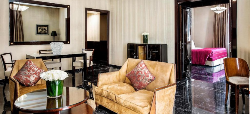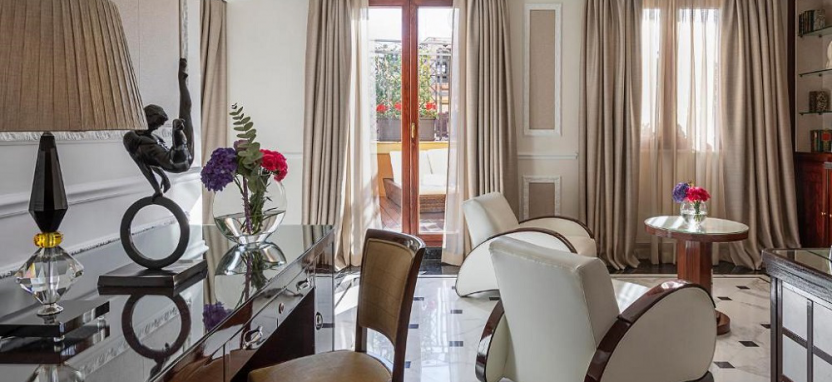 Junior Suite 2/3 pax (50-55 кв. м) - просторные сюиты, оформленные в стиле арт деко, вид на внутренний двор, римские улицы или знаменитую улицу Венето, просторная гостиная зона, спальня, ванная комната, облицованная итальянским мрамором, в некоторых сюитах данной категории есть балконы, выходящие на знаменитую улицу Венето.