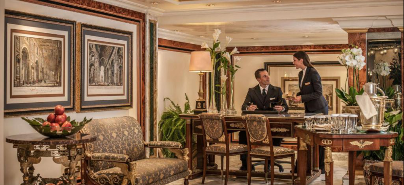 Corner Suite (87 кв. м) - элегантные угловые сюиты с роскошной мебелью и оригинальными произведениями искусства, захватывающий вид на Рим, отдельная гостиная с мягким диваном и креслами, спальня с двуспальной кроватью, ванная комната, отделанная мрамором, с ванной и душевой кабиной, двойной балкон, доступ в Imperial Club.
