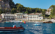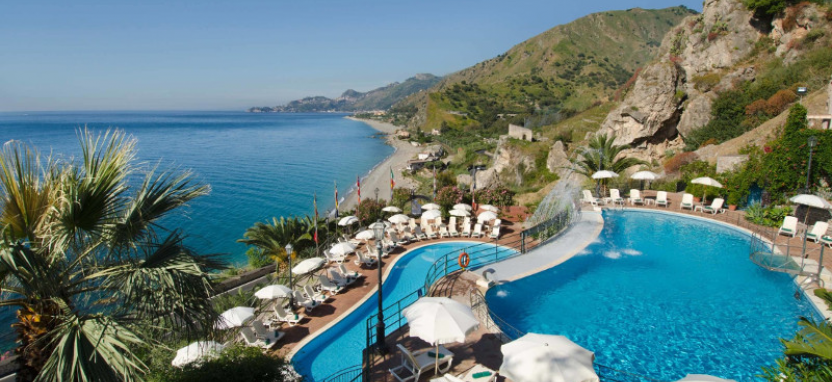 Baia Taormina - современный отель, расположенный на живописном склоне горы и террасами спускающийся к морю. Отель был построен в 1998 году в стиле традиционных сицилийских вилл и состоит из двух корпусов - Baia Taormina Classic и Baia Taormina Grand Palace, которые различаются классическим и современным стилем оформления внутренних помещений и номеров. На территории комплекса множество декоративных арок, беседок, терракотовых мозаик и рельефов, каменных террас с панорамным видом на Таорминский залив и чистейшее Ионическое море. На крыше отеля разбит сад с летней верандой. Недалеко от отеля на мысе Капо Сант Алессио возвышается исторический замок, на территории которого с июня по сентябрь проводятся различные культурные мероприятия.
