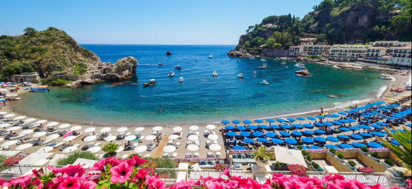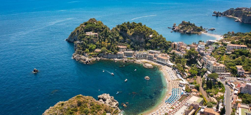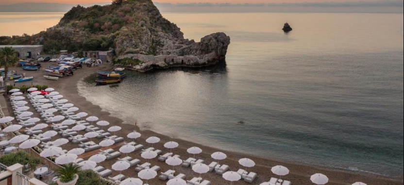 Восточное побережье Сицилии, на берегу бухты Маццаро, между скалистыми выступами, в двух шагах от нижней станции канатной дороги, ведущей в исторический центр Таормины, 60 километров до международного аэропорта Катания.