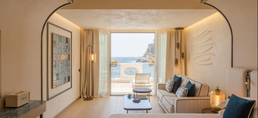 Junior Suite Sea View 2/3 pax (30 кв. м) - сюиты с элегантными интерьерами в ярких тонах, прекрасный вид на залив Маццаро, просторная гостиная зона с диваном, спальня с двуспальной кроватью, ванная комната, отделанная мрамором, балкон или терраса.