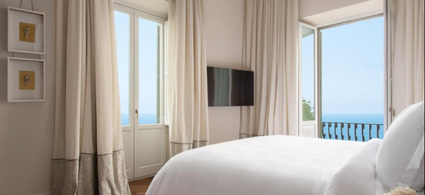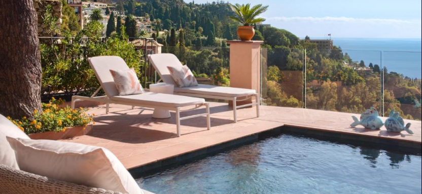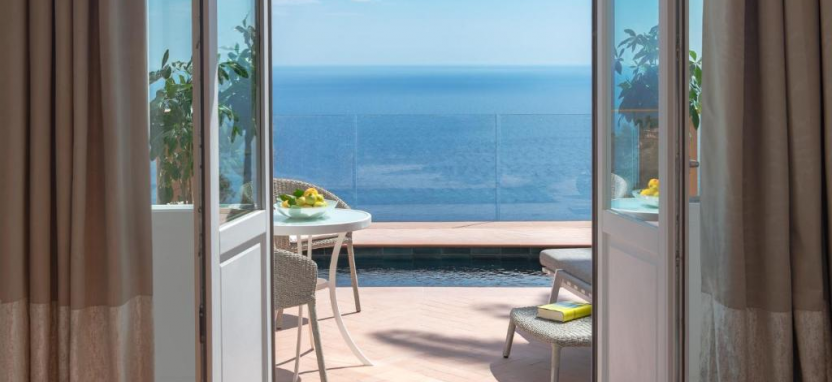 San Domenico Suite (88 кв. м) - в номере терраса с открытым персональным бассейном и обеденной зоной на открытом воздухе, гостиная, столовая, спальня с кроватью king-size, ванная комната с ванной и душевой кабиной. Вид на море.