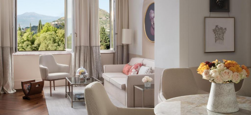 Его номера и сьюты отличаются непревзойденной элегантностью, легкостью и захватывающим видом на море и гору Этна. На территории гостиницы несколько ресторанов (в том числе один со звездой Мишлен), открытый бассейн и спа-центр.
