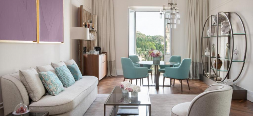 Royal Suite (140 кв. м) - в номере терраса с открытым персональным бассейном и обеденной зоной на открытом воздухе, гостиная, столовая (стол на 8 персон), спальня с кроватью king-size, гардеробная, ванная комната с ванной и душевой кабиной, гостевой туалет. Расположены на верхнем этаже отеля. Вид на море и греческий театр. Возможно объединение с номером категории Premium sea view room with terrace.