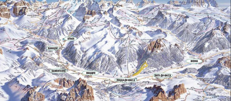 | Лыжный сезон: декабрь – апрель Перепад высот: 1200 – 2950 м Горнолыжные трассы Валь ди Фасса: общая протяженность – 200 км из них простых – 60 км средних – 121 км сложных – 16 км Протяженность трасс Валь ди Фасса для равнинных лыж: 60 км b>Количество подъемников:фуникулер – 7, кабина – 36, кресельные – 36, бугельные – 34 Расстояние от аэропорта: Милан – 350 км, Венеция – 170 км, Инсбрук – 150 км, Цюрих – 435 км |