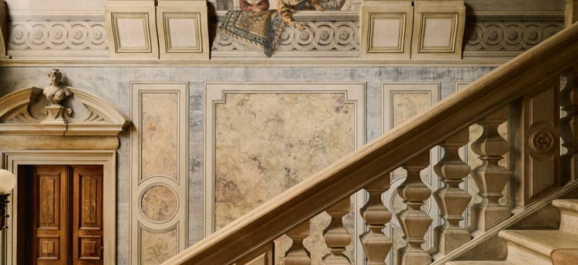 Palazzo Chamber Affresco (49 кв. м) - номера с красивыми историческими фресками, вид на частный сад, гостиная зона с письменным столом и диваном, спальня с большой двуспальной кроватью, ванная комната.