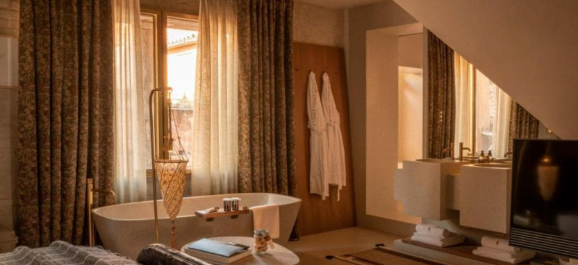 Каждый номер и сьют гостиницы отличается индивидуальной планировкой и расположением, а самые роскошные имеют балкон или высокие окна с видом на Мост Риальто. Комнаты, в которых очаровательная ванна разместилась прямо в спальне, несомненно, оценят молодые пары.