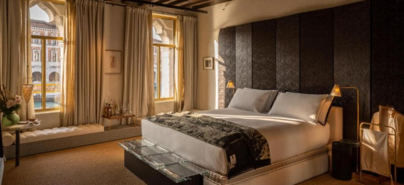 Special Postvenetian Suite (114 кв. м) - сьют номер 24 с высокими потолками, состоит из 2 спален с кроватями king-bed и гостиной. Вид на Большой Канал и Мост Риальто. Размещение до 5 гостей.