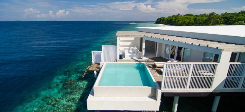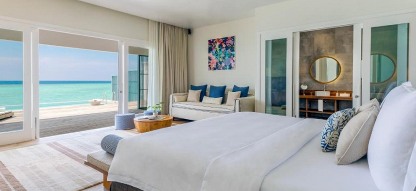 Reef Water Pool Villa (220 кв. м – общая площадь, 130 кв. м – внутреннее пространство, 90 кв. м – открытое пространство) – водная вилла. Кровать king-size, диван-кровать, детская кроватка или раскладушка, гостиная зона, письменный стол, ванная комната открытого плана с ванной и душем, меблированная терраса с бассейном, шезлонгами, зоной отдыха, тропическим душем, спуском в воду и видом на океан. Размещение – 3 взрослых или 2 взрослых с 2 детьми.