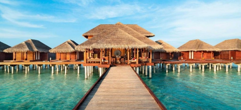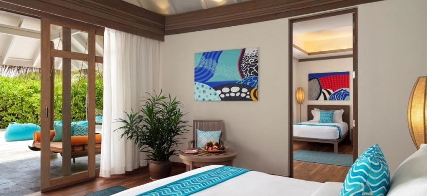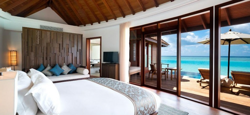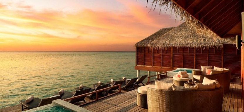 Sunrise Over Water Suite (119 кв. м) – водный люкс с видом на восход солнца. Кровать king-size, зона отдыха, диван, письменный стол, ванная комната с панорамными окнами, двумя раковинами, ванной и тропическим душем, терраса с шезлонгами, зоной отдыха, надводным гамаком, спуском в воду и видом на океан. Размещение – 3 взрослых с 1 ребенком.