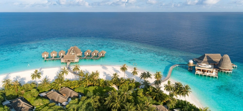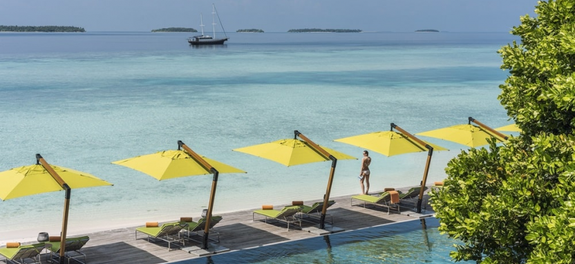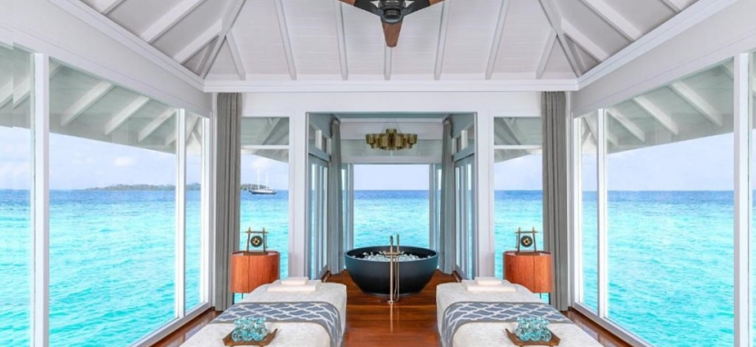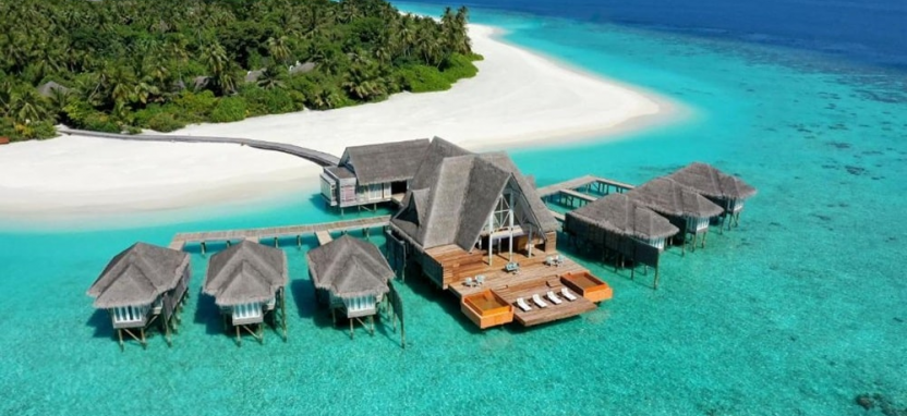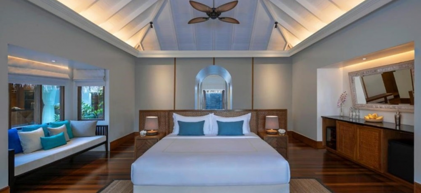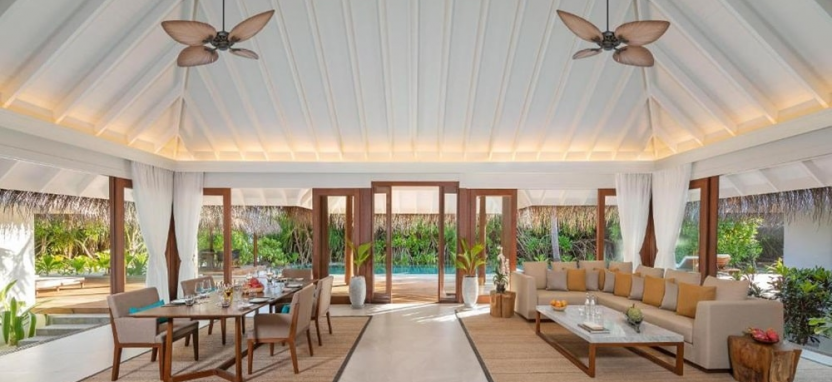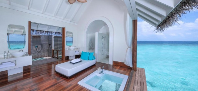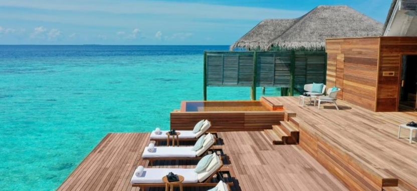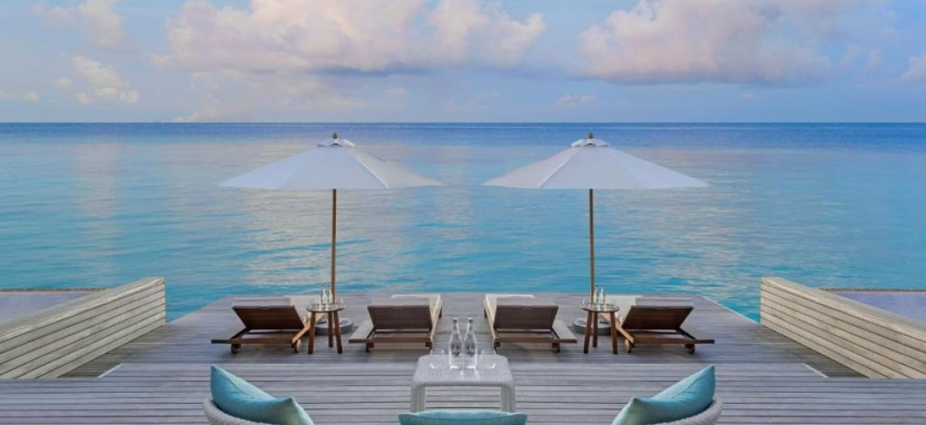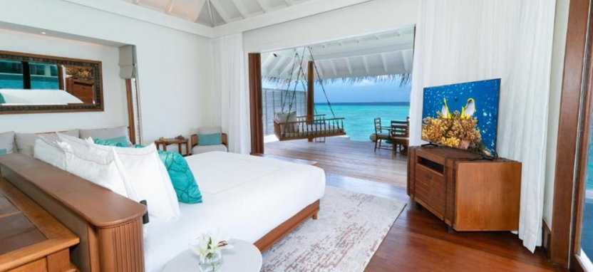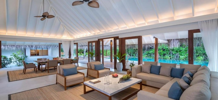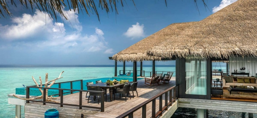 Over Water Pool Villa (267 кв. м) – водная вилла. Кровать king-size, письменный стол, ванная комната с двумя раковинами, встроенной в пол ванной и душевой, личные велосипеды, меблированная терраса с бассейном, надводным гамаком, шезлонгами, подвесным диваном, обеденной зоной, спуском в воду и видом на океан. Размещение – 3 взрослых с ребенком.