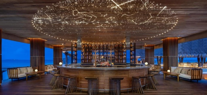Sunset Over Water Pool Villa (267 кв. м) – водная вилла с видом на закат. Кровать king-size, письменный стол, ванная комната с двумя раковинами, встроенной в пол ванной и душевой, личные велосипеды, меблированная терраса с бассейном, надводным гамаком, шезлонгами, подвесным диваном, обеденной зоной, спуском в воду и видом на океан. Размещение – 3 взрослых с ребенком.