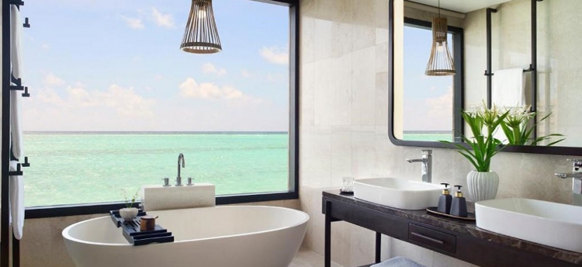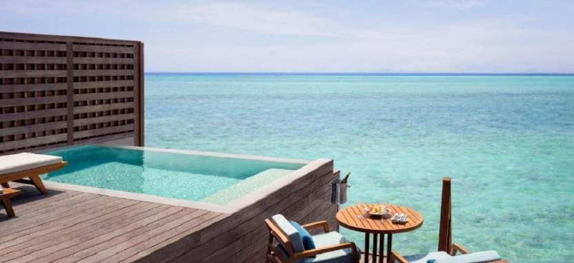 Over Water Pool Villa (111 кв. м) – водная вилла. Кровать king-size, зона отдыха с диваном, ванная комната с двумя раковинами, ванной с панорамными окнами и душем, терраса с бассейном, зоной отдыха, шезлонгами, спуском в воду и видом на океан. Размещение – 3 человека.