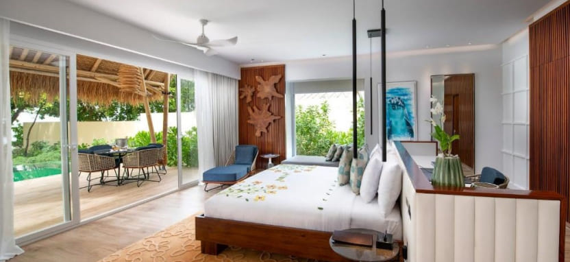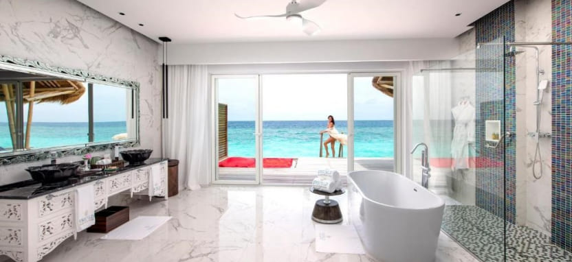 Water Villa with Pool Sea View (187 кв. м) – водная вилла. Спальня с кроватью king-size, зона отдыха, рабочая зона, просторная ванная комната с гидромассажной ванной и душем, меблированная терраса с бассейном 5х3 м, спуском в воду и видом на океан. Размещение – до 4 человек.