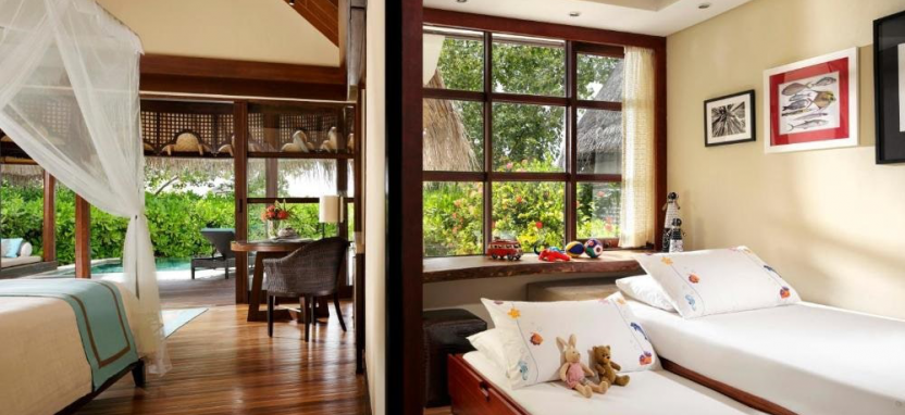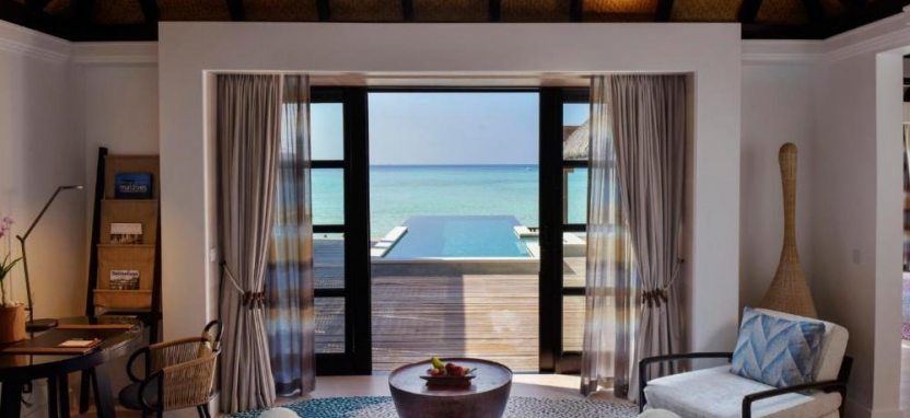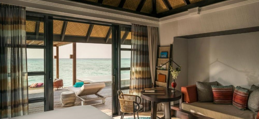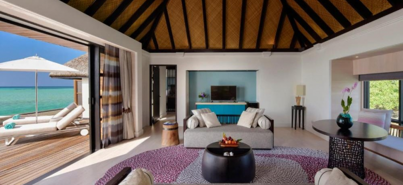 Sunrise Three-Bedroom Water Suite (240 кв. м, внешняя территория 278 кв. м) – водная вилла с тремя спальнями и видом на восход солнца. 2 спальни с кроватями king-size, спальня с двумя односпальными кроватями, раскладушка в каждой спальне, гостиная с обеденной зоной, гардеробная, 3 ванные комнаты, меблированная терраса с бассейном, зоной отдыха, обеденной зоной, надводным гамаком, спуском в воду и видом на океан. Размещение – 6 взрослых с 2 детьми.